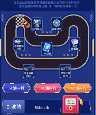玩家需要获取油量进行赛道冲刺,整个赛道总共有7种奖励,油量越高,就能冲刺得更远,获得更为精美的奖励。奖励包含改装科技箱小、188点券、许愿银币、高级能量体、A车双生战神共45天、永久A车苍穹绝影。