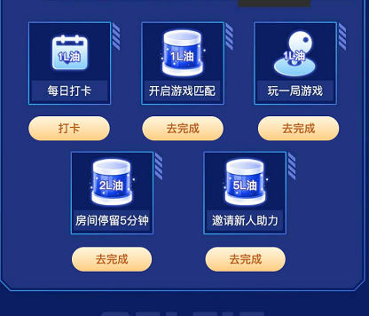 完成每日打卡、游戏匹配、游玩一局游戏、在皮皮蟹房间停留5分钟或者邀请新人助力等日常任务,都能获得油量。大家记得要多攒些油量,再去冲刺赛道奖励哦。