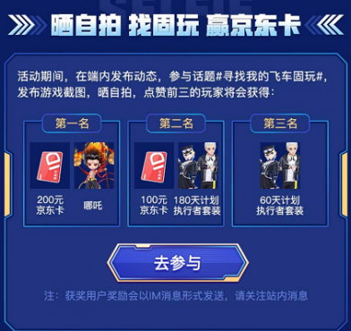 在皮皮蟹APP内发布动态,参与话题#寻找我的飞车固玩#,并发布游戏截图和自拍,获得点赞数前三的玩家即可领取诸多好礼。获得点赞数量最多的用户可以拿到200元京东卡和哪吒,获得点赞数量第二的用户获得100元京东卡和180天计划执行者套装,点赞数第三名的用户获得60天计划执行者套装。大家可要抓紧这次活动机会,争取拿下奖励,并且找到固玩,一举多得。