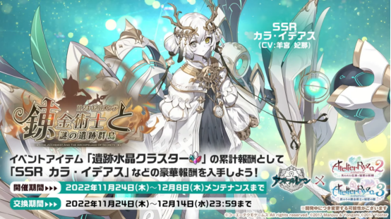 此外,直播中还爆料,累计足够多的「遗迹水晶簇」就能直接获得《莱莎的炼金工房3》中的全新角色「卡菈·伊迪亚斯」,只要积极参与活动,人人可得!