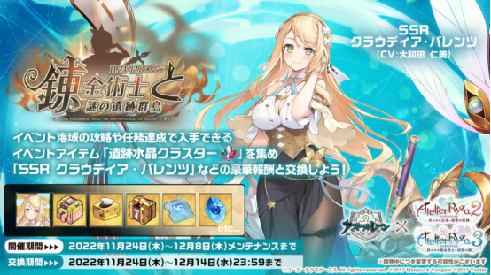 11月24日维护后,限时联动活动「炼金术士与秘密遗迹群岛」将正式开启,活动时间从11月24日开始至12月8日结束,在作战周期内,每一次成功击败BOSS关卡,都可获得「遗迹水晶簇」,积累大量的「遗迹水晶簇」在活动商店可以兑换限定联动舰船「科洛蒂娅·巴兰茨」(超稀有)及活动家具等丰厚奖励。